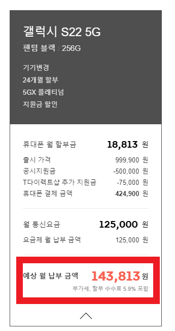 우리는 통신사에게서 575,000원(약 58만원)을 지원받기 위해 매월 125,000원(약 13만원)짜리 요금제를 사용해야 합니다. 그리고 매달 지불해야할 휴대폰 구매대금의 할부 납부금까지 계산해보면 매월 143,813원(약 14만원)의 요금을 납부해야하는데요.