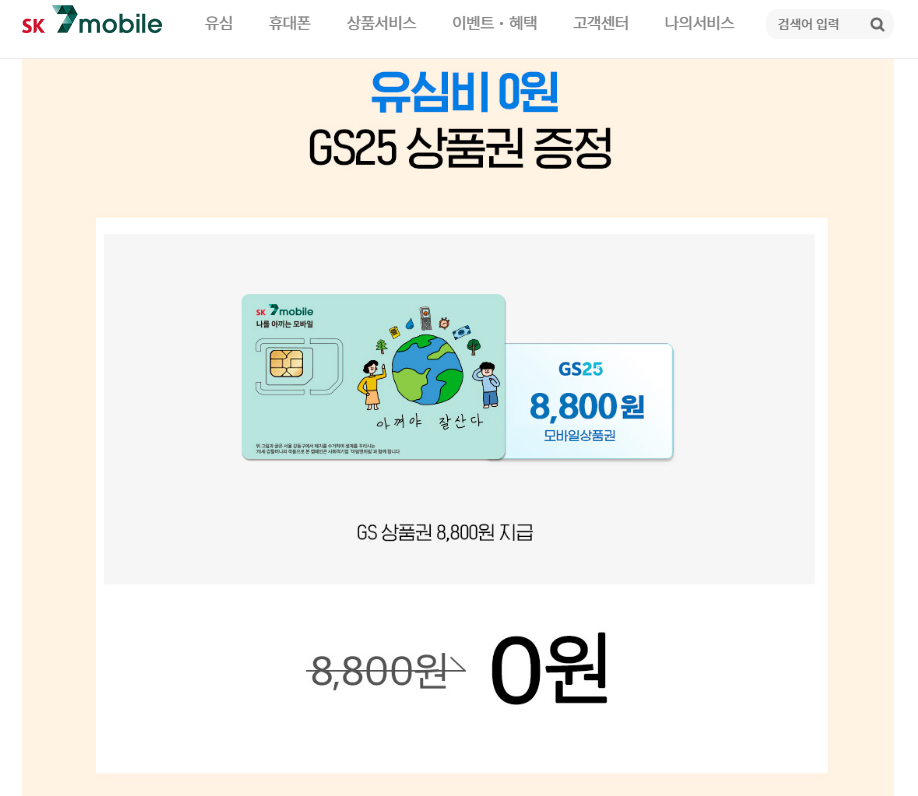 SK 세븐 모바일에서는 이벤트 기간 동안 유심칩 가격(8,800원)만큼의 GS25 상품권을 증정하는 이벤트를 진행하고 있습니다.